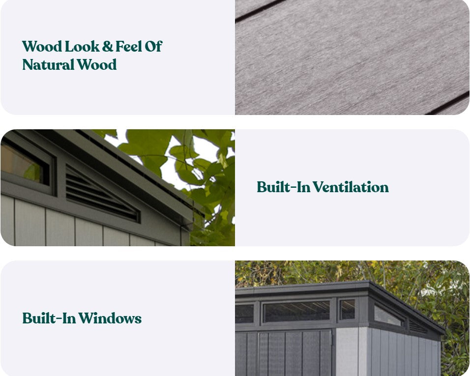 The Artisan 7×7 shed is supremely durable yet stylish. It has a weather-resistant double wall build with steel reinforcement, a heavy-duty floor for storing even major items, and a robust ceiling. Design-wise, it has an attractive rustic chic style thanks to its unique paintable DUOTECH™ walls with a weathered wooden texture, a crystal clear windows, a skylight, and double doors.