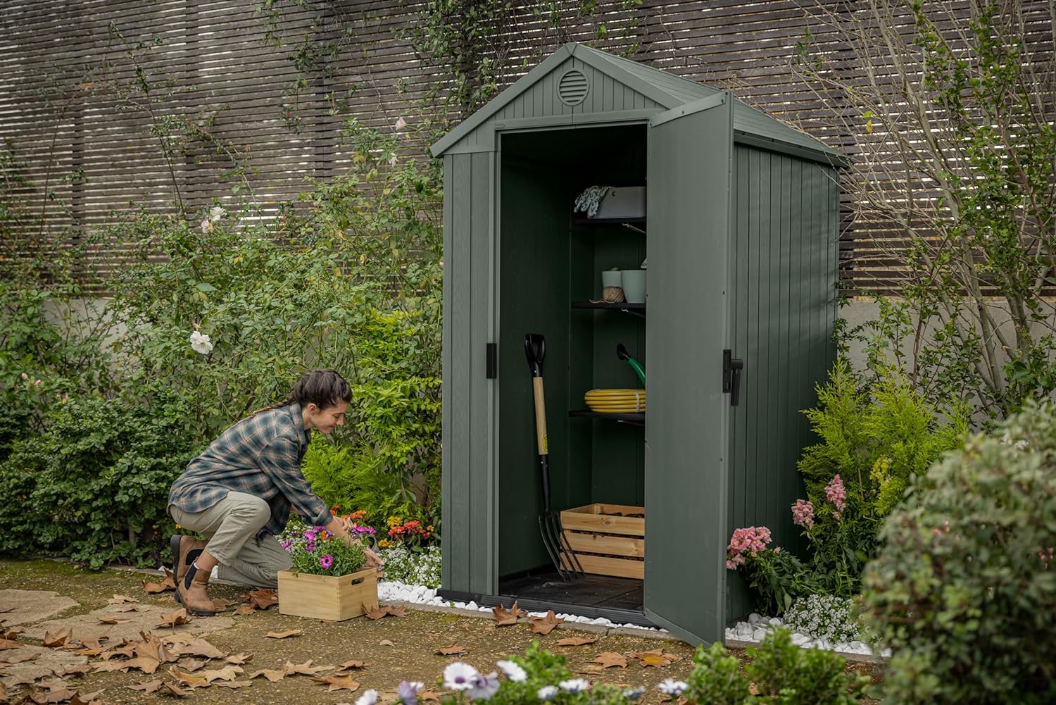 The evolutionary Darwin composite shed is the perfect design if you desire the look of a wooden shed but with all the benefits of resin. The Keter Darwin 4x4 is perfect for the smaller outdoor areas. Featuring a wood look and feel without the maintenance, the Darwin is hassle free. A floor panel is included to protect items from mud and groundwater and is metal-reinforced for super strength and durability, and it's completely weatherproof for year-round protection. Plus its double-wall panels are made of our exclusive Evotech material which provides the innovative look and feel but is also 100% recyclable. It includes practical touches like a vent for air circulation to prevent moisture build up.