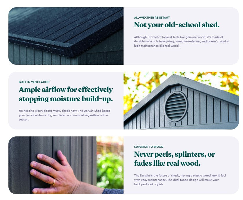 The Darwin 6×6 looks great in any garden, and with its ample storage capacity, things will no longer be left out because there’s no place to put them. This shed features a sturdy floor to protect what’s in it from mud and groundwater, double doors so you can access what you want easily, and a window and skylight so you can see everything.