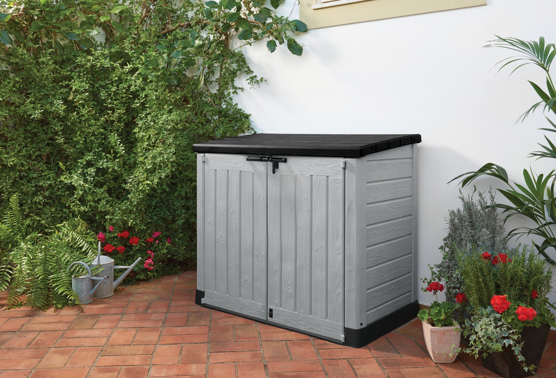 The Store It Out Max is a durable, fully weather resistant storage shed with sloped threshold for easy wheeled access. Features include a 1200lt capacity, easy to open gas strut assisted lid, lockable double doors, floor panel and bonus bin opening kit.