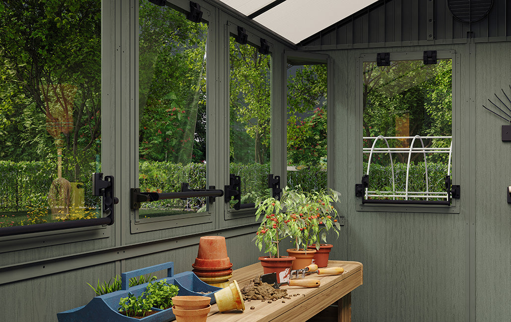 Bright, Weather-Resistant Design: Featuring an innovative hybrid roof, the Keter Potting Shed combines a translucent section to let in natural sunlight with an opaque section for protection from the elements. 7 easy-open windows and two fixed corner windows provide excellent ventilation and light-filled environment.