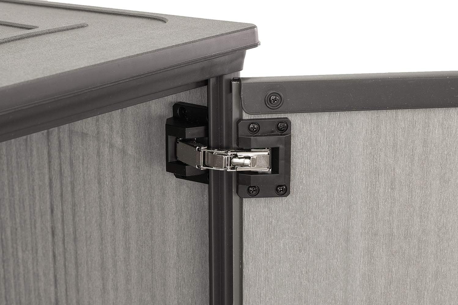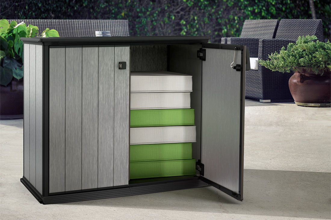 The Patio Store is extremely versatile and durable. Elegant and practical, this storage unit will look fantastic in any garden, patio or balcony, as it brings a chic rustic accent to your outdoor space with its highly realistic wood effect texture. The 1000L capacity provides plenty of storage space for furniture and pillows, pool equipment, or a lawnmower, while the strong roof is perfect for placing planters or gardening tools. Heavier items can be easily rolled in and out of the unit thanks to the sloped threshold. The Patio Store also comes with lockable doors, heavy-duty 105° nickel hinges, and adjustable brackets that let you quickly install an extra shelf, if needed.