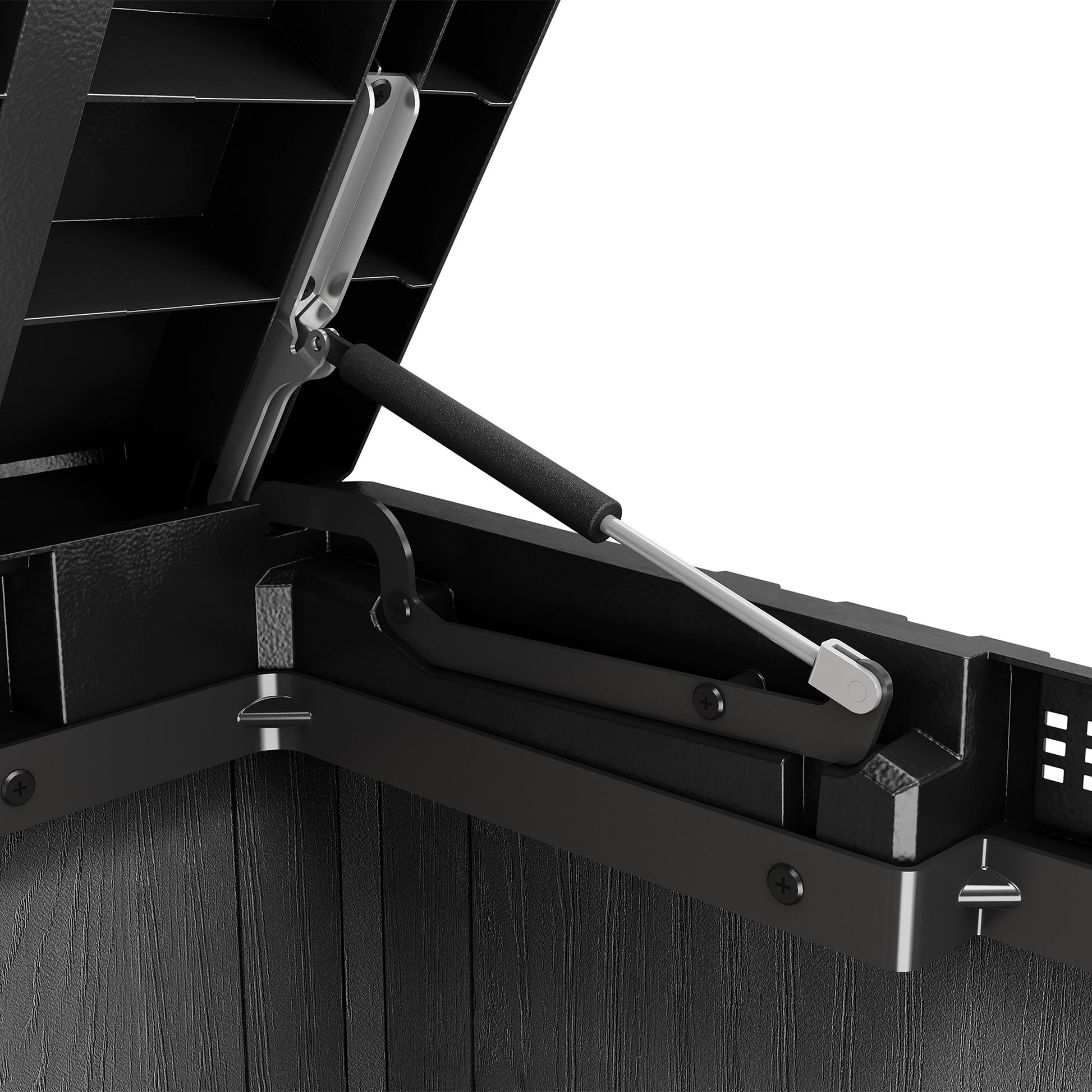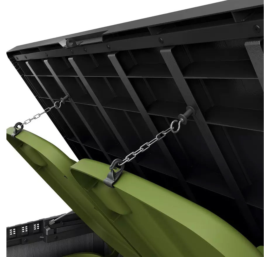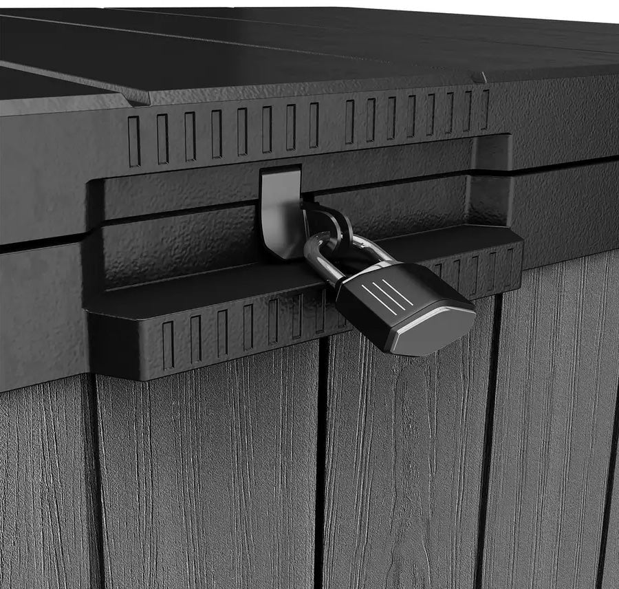 The opening roof and double doors provide easy access to the interior, allowing for convenient storage and easy insertion and removal of items. The box is also equipped with a locking mechanism. Built-in ventilation ensures optimal storage conditions, protecting your belongings from moisture and adverse weather conditions. With brackets that keep the shelves in place, the box offers maximum functionality and space organization.